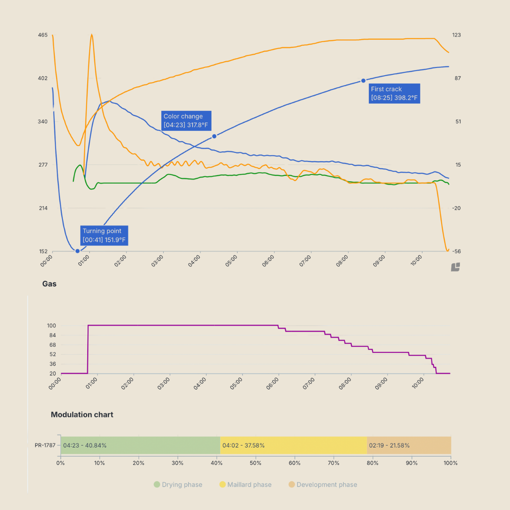 Start-/End weight: 24 lb / 20.4 lb Weight loss: -15% First crack: 08:25 Duration: 10:44 Dev. time: 02:19 Dev. time ratio: 21.6% Roast value: 65 Agtron Start temp. 388.5°F End temp. 418.5°F